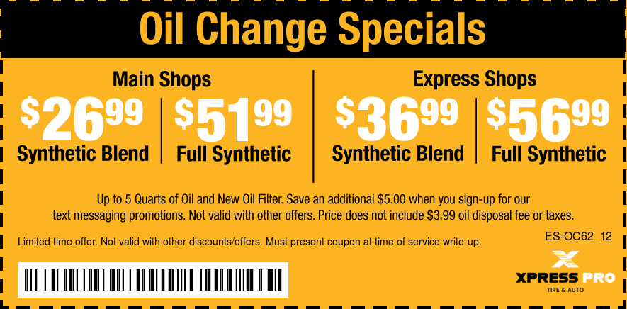 Good only atXpress Pro Tire & Auto Beech Grove Schedule Service Print coupon Offer details Oil Change Specials $26.99/$51.99/$36.99/$56.99 * See coupon for exclusions. Email Coupon First name * Last name * Email address * Sign me up to receive future text offers from Xpress Pro Tire & Auto Beech Grove: Via Text Cell/Mobile Phone By clicking "I accept" below, I expressly agree to receive marketing text messages made by or on behalf of Xpress Pro Tire & Auto Beech Grove to the telephone number(s) I’ve listed above. I understand that I may receive such text messages by the use of Automatic Telephone Dialing Systems (including “Predictive Dialers” or “Autodialers”) and I agree to receive them even if I have registered my number(s) with my state or federal Do-Not-Call list(s). I understand that such text messages will include advertising containing offers for goods or services and that I may revoke this consent at any time by telephone, return text message or by Visiting xpresspro.com/local/in/beech-grove/stop to unsubscribe. Message and data rates may apply. I also understand that I am NOT required to provide this consent as a condition of purchasing goods or services. I accept View: Text Specials Terms and Conditions with this link.