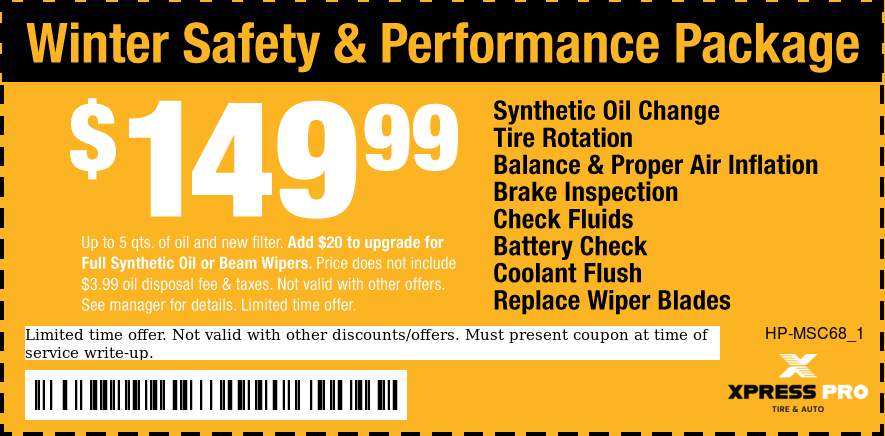 Good only atXpress Pro Tire & Auto Castleton Schedule Service Print coupon Offer details Winter Safety & Performance Package $149.99 * See coupon for exclusions. Email Coupon First name * Last name * Email address * Sign me up to receive future text offers from Xpress Pro Tire & Auto Castleton : Via Text Cell/Mobile Phone By clicking "I accept" below, I expressly agree to receive marketing text messages made by or on behalf of Xpress Pro Tire & Auto Castleton to the telephone number(s) I’ve listed above. I understand that I may receive such text messages by the use of Automatic Telephone Dialing Systems (including “Predictive Dialers” or “Autodialers”) and I agree to receive them even if I have registered my number(s) with my state or federal Do-Not-Call list(s). I understand that such text messages will include advertising containing offers for goods or services and that I may revoke this consent at any time by telephone, return text message or by Visiting xpresspro.com/local/in/castleton/stop to unsubscribe. Message and data rates may apply. I also understand that I am NOT required to provide this consent as a condition of purchasing goods or services. I accept View: Text Specials Terms and Conditions with this link.