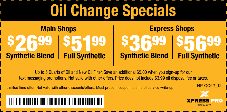 Good only atXpress Pro Tire & Auto Greenwood US31 Schedule Service Print coupon Offer details Oil Change Specials $26.99/$51.99/$36.99/$56.99 * See coupon for exclusions. Email Coupon First name * Last name * Email address * Sign me up to receive future text offers from Xpress Pro Tire & Auto Greenwood US31 : Via Text Cell/Mobile Phone By clicking "I accept" below, I expressly agree to receive marketing text messages made by or on behalf of Xpress Pro Tire & Auto Greenwood US31 to the telephone number(s) I’ve listed above. I understand that I may receive such text messages by the use of Automatic Telephone Dialing Systems (including “Predictive Dialers” or “Autodialers”) and I agree to receive them even if I have registered my number(s) with my state or federal Do-Not-Call list(s). I understand that such text messages will include advertising containing offers for goods or services and that I may revoke this consent at any time by telephone, return text message or by Visiting xpresspro.com/local/in/greenwood-us31/stop to unsubscribe. Message and data rates may apply. I also understand that I am NOT required to provide this consent as a condition of purchasing goods or services. I accept View: Text Specials Terms and Conditions with this link.