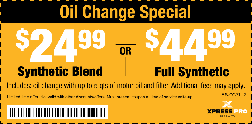 Good only atXpress Pro Tire & Auto Michigan Rd Request Appointment Print coupon Offer details Oil Change Special $24.99 Synthetic Blend $44.99 Full Synthetic * See coupon for exclusions. Email Coupon First name * Last name * Email address * Sign me up to receive future text offers from Xpress Pro Tire & Auto Michigan Rd: Via Text Mobile Phone By clicking "I accept" below, I expressly agree to receive marketing text messages made by or on behalf of Xpress Pro Tire & Auto Michigan Rd to the telephone number(s) I’ve listed above. I understand that I may receive such text messages by the use of Automatic Telephone Dialing Systems (including “Predictive Dialers” or “Autodialers”) and I agree to receive them even if I have registered my number(s) with my state or federal Do-Not-Call list(s). I understand that such text messages will include advertising containing offers for goods or services and that I may revoke this consent at any time by telephone, return text message or by Visiting xpresspro.com/local/in/michigan-rd/stop to unsubscribe. Message and data rates may apply. I also understand that I am NOT required to provide this consent as a condition of purchasing goods or services. I accept View: Text Specials Terms and Conditions with this link.