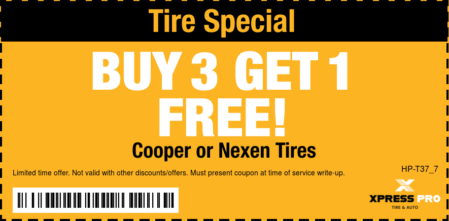 Good only atXpress Pro Tire & Auto Finneytown Schedule Service Print coupon Offer details Tire Special Buy 3 Get 1 FREE (Nexen/Cooper Tires) * See coupon for exclusions. Email Coupon First name * Last name * Email address * Sign me up to receive future text offers from Xpress Pro Tire & Auto Finneytown: Via Text Cell/Mobile Phone By clicking "I accept" below, I expressly agree to receive marketing text messages made by or on behalf of Xpress Pro Tire & Auto Finneytown to the telephone number(s) I’ve listed above. I understand that I may receive such text messages by the use of Automatic Telephone Dialing Systems (including “Predictive Dialers” or “Autodialers”) and I agree to receive them even if I have registered my number(s) with my state or federal Do-Not-Call list(s). I understand that such text messages will include advertising containing offers for goods or services and that I may revoke this consent at any time by telephone, return text message or by Visiting xpresspro.com/local/oh/finneytown/stop to unsubscribe. Message and data rates may apply. I also understand that I am NOT required to provide this consent as a condition of purchasing goods or services. I accept View: Text Specials Terms and Conditions with this link.