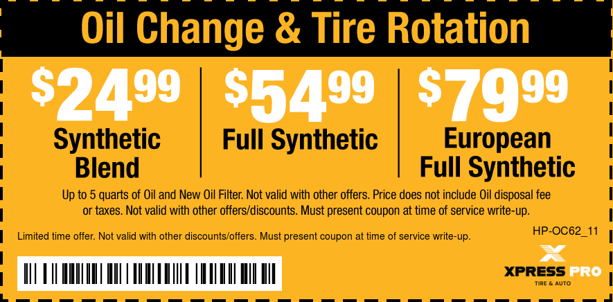Good only atXpress Pro Tire & Auto Kettering Schedule Service Print coupon Offer details Oil Change and Tire Rotation $24.99/$54.99/$79.99 * See coupon for exclusions. Email Coupon First name * Last name * Email address * Sign me up to receive future text offers from Xpress Pro Tire & Auto Kettering : Via Text Cell/Mobile Phone By clicking "I accept" below, I expressly agree to receive marketing text messages made by or on behalf of Xpress Pro Tire & Auto Kettering to the telephone number(s) I’ve listed above. I understand that I may receive such text messages by the use of Automatic Telephone Dialing Systems (including “Predictive Dialers” or “Autodialers”) and I agree to receive them even if I have registered my number(s) with my state or federal Do-Not-Call list(s). I understand that such text messages will include advertising containing offers for goods or services and that I may revoke this consent at any time by telephone, return text message or by Visiting xpresspro.com/local/oh/kettering/stop to unsubscribe. Message and data rates may apply. I also understand that I am NOT required to provide this consent as a condition of purchasing goods or services. I accept View: Text Specials Terms and Conditions with this link.