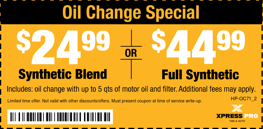 Good only atXpress Pro Tire & Auto Fishers Request Appointment Print coupon Offer details Oil Change Special $24.99 Synthetic Blend $44.99 Full Synthetic * See coupon for exclusions. Email Coupon First name * Last name * Email address * Sign me up to receive future text offers from Xpress Pro Tire & Auto Fishers: Via Text Mobile Phone By clicking "I accept" below, I expressly agree to receive marketing text messages made by or on behalf of Xpress Pro Tire & Auto Fishers to the telephone number(s) I’ve listed above. I understand that I may receive such text messages by the use of Automatic Telephone Dialing Systems (including “Predictive Dialers” or “Autodialers”) and I agree to receive them even if I have registered my number(s) with my state or federal Do-Not-Call list(s). I understand that such text messages will include advertising containing offers for goods or services and that I may revoke this consent at any time by telephone, return text message or by Visiting xpresspro.com/local/in/fishers/stop to unsubscribe. Message and data rates may apply. I also understand that I am NOT required to provide this consent as a condition of purchasing goods or services. I accept View: Text Specials Terms and Conditions with this link.