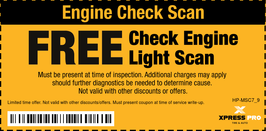 Good only atXpress Pro Tire & Auto Fishers Request Appointment Print coupon Offer details Engine Check Scan FREE * See coupon for exclusions. Email Coupon First name * Last name * Email address * Sign me up to receive future text offers from Xpress Pro Tire & Auto Fishers: Via Text Mobile Phone By clicking "I accept" below, I expressly agree to receive marketing text messages made by or on behalf of Xpress Pro Tire & Auto Fishers to the telephone number(s) I’ve listed above. I understand that I may receive such text messages by the use of Automatic Telephone Dialing Systems (including “Predictive Dialers” or “Autodialers”) and I agree to receive them even if I have registered my number(s) with my state or federal Do-Not-Call list(s). I understand that such text messages will include advertising containing offers for goods or services and that I may revoke this consent at any time by telephone, return text message or by Visiting xpresspro.com/local/in/fishers/stop to unsubscribe. Message and data rates may apply. I also understand that I am NOT required to provide this consent as a condition of purchasing goods or services. I accept View: Text Specials Terms and Conditions with this link.